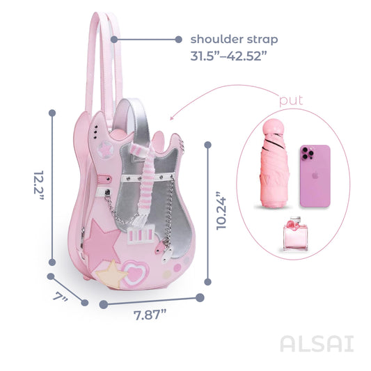 Kawaii Silver Pink Guitar-Shaped Backpack – Creative Contrast Color Crossbody & Shoulder Bag with Cute Scarf, Rock Style Handbag for Girls & Women